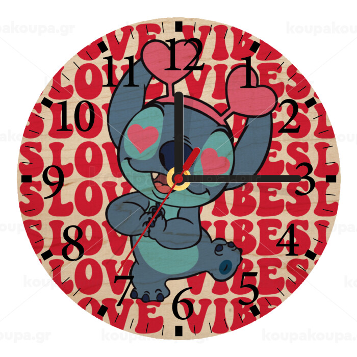 Lilo & Stitch Love vibes, Ρολόι τοίχου ξύλινο plywood (20cm)