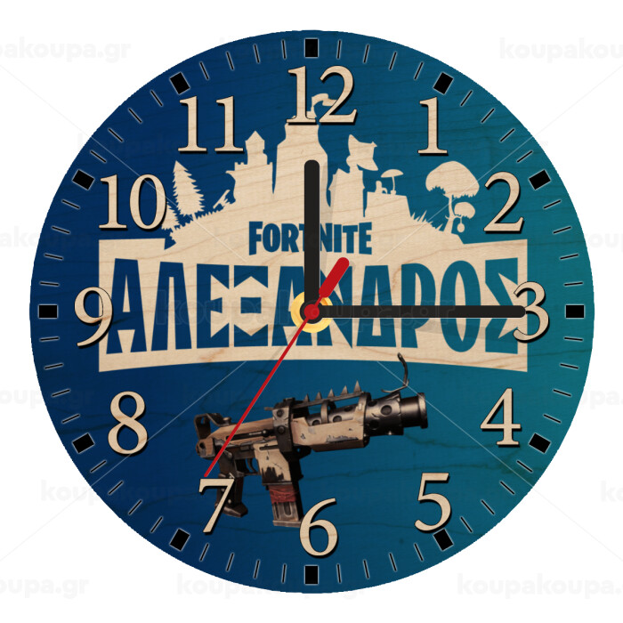 Fortnite with gun με το όνομα σου, Ρολόι τοίχου ξύλινο plywood (20cm)