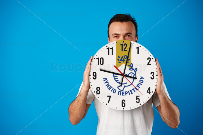 Έμβλημα Σχολικό μπλε/χρυσό περιστέρι, Ρολόι τοίχου ξύλινο (30cm)