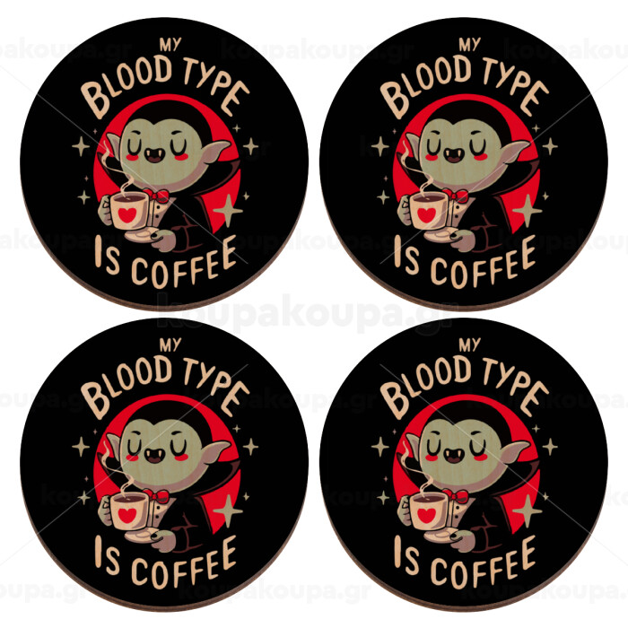 My blood type is coffee, ΣΕΤ x4 Σουβέρ ξύλινα στρογγυλά plywood (9cm)