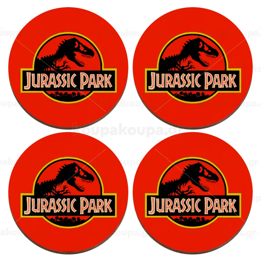 Jurassic park, ΣΕΤ x4 Σουβέρ ξύλινα στρογγυλά plywood (9cm)