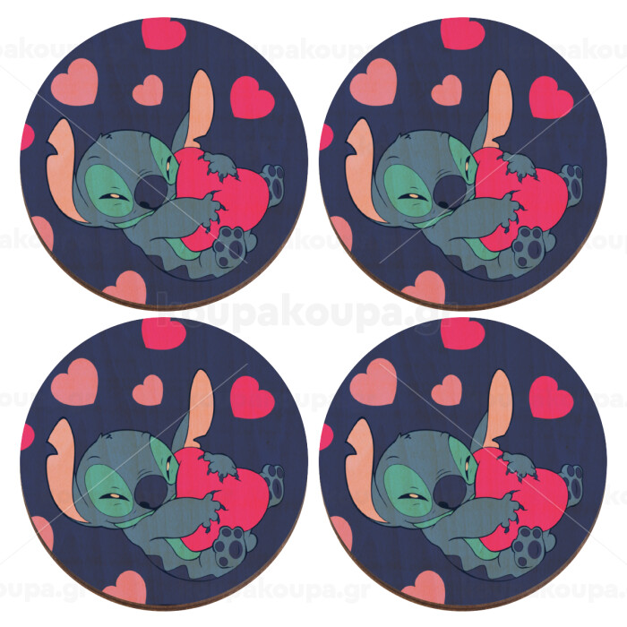 Lilo & Stitch hugs and hearts, ΣΕΤ x4 Σουβέρ ξύλινα στρογγυλά plywood (9cm)