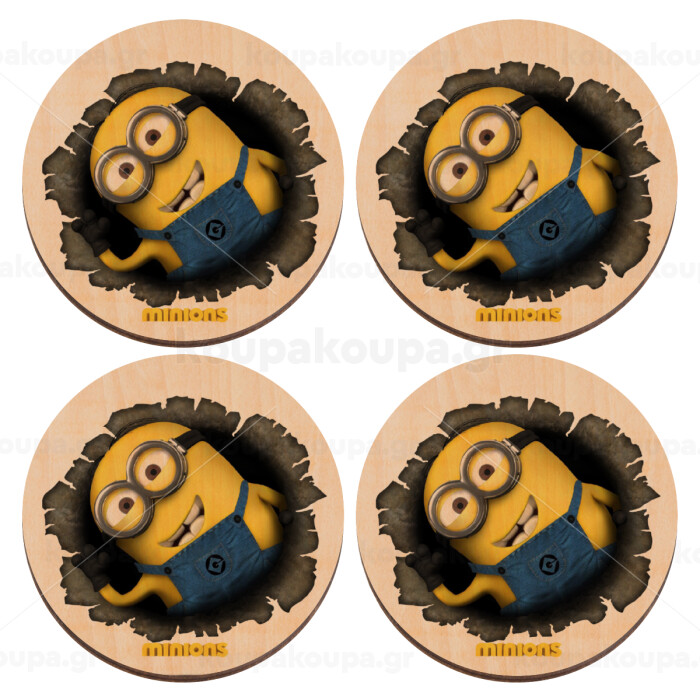Minions hi, ΣΕΤ x4 Σουβέρ ξύλινα στρογγυλά plywood (9cm)