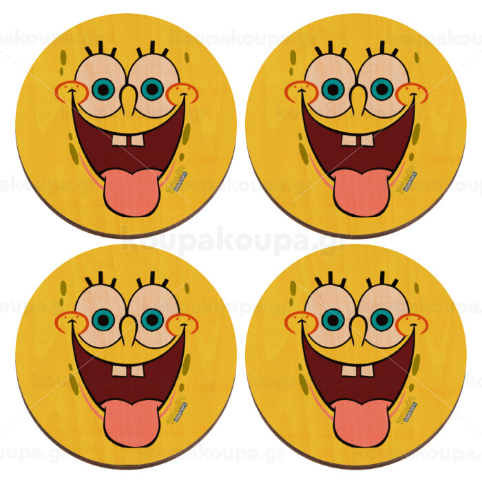 Μπομπ Σφουγγαράκης χαμόγελο, ΣΕΤ x4 Σουβέρ ξύλινα στρογγυλά plywood (9cm)
