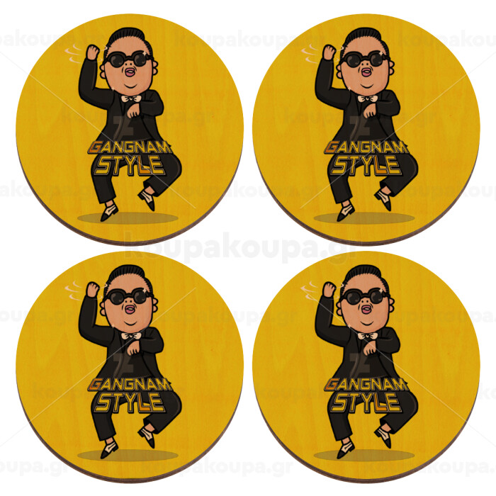 PSY - GANGNAM STYLE, ΣΕΤ x4 Σουβέρ ξύλινα στρογγυλά plywood (9cm)