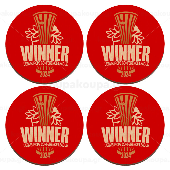 Europa Conference League WINNER, ΣΕΤ x4 Σουβέρ ξύλινα στρογγυλά plywood (9cm)
