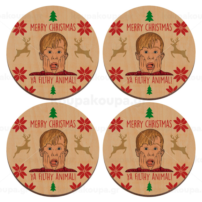 home alone, Merry Christmas ya filthy animal, ΣΕΤ x4 Σουβέρ ξύλινα στρογγυλά plywood (9cm)