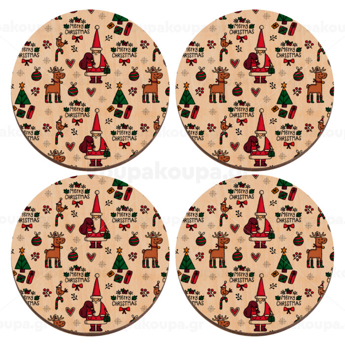Santas, Deers & Trees, ΣΕΤ x4 Σουβέρ ξύλινα στρογγυλά plywood (9cm)