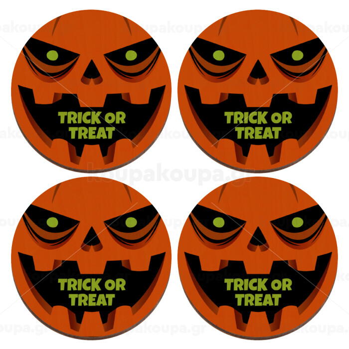 Halloween trick or treat Pumpkins, ΣΕΤ x4 Σουβέρ ξύλινα στρογγυλά plywood (9cm)