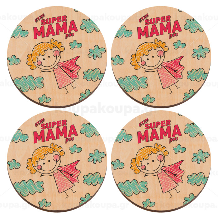 Στην SUPER μαμά μου, comic, ΣΕΤ x4 Σουβέρ ξύλινα στρογγυλά plywood (9cm)