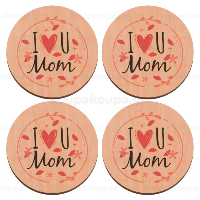 I Love you Mom pink, ΣΕΤ x4 Σουβέρ ξύλινα στρογγυλά plywood (9cm)