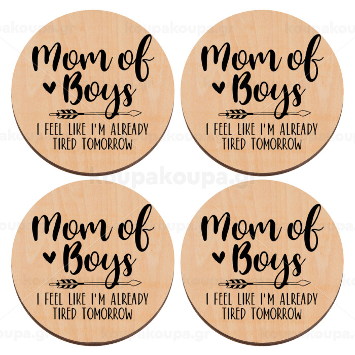 Mom of boys i feel like im already tired tomorrow, ΣΕΤ x4 Σουβέρ ξύλινα στρογγυλά plywood (9cm)