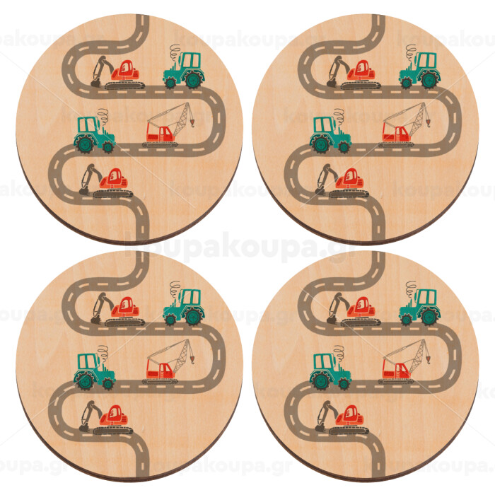 Αμαξάκια στον δρόμο, ΣΕΤ x4 Σουβέρ ξύλινα στρογγυλά plywood (9cm)