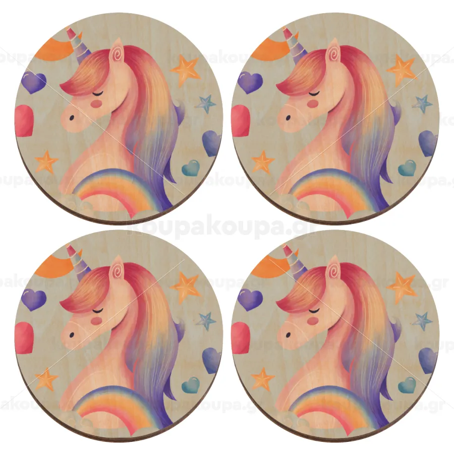 Μονόκερος, ΣΕΤ x4 Σουβέρ ξύλινα στρογγυλά plywood (9cm)