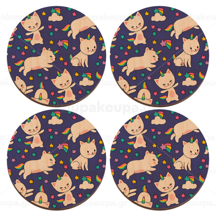 Cats unicorns, ΣΕΤ x4 Σουβέρ ξύλινα στρογγυλά plywood (9cm)