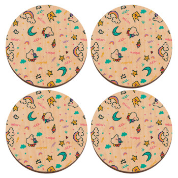 Unicorn pattern white, ΣΕΤ x4 Σουβέρ ξύλινα στρογγυλά plywood (9cm)