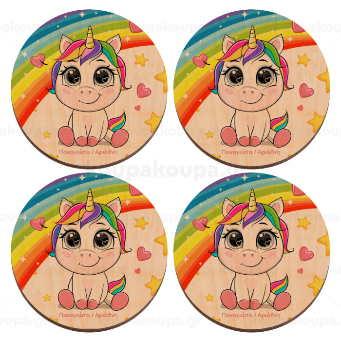 Unicorn baby με όνομα, ΣΕΤ x4 Σουβέρ ξύλινα στρογγυλά plywood (9cm)