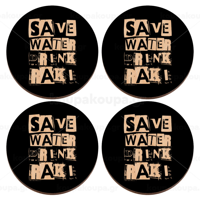 Save Water, Drink RAKI, ΣΕΤ x4 Σουβέρ ξύλινα στρογγυλά plywood (9cm)