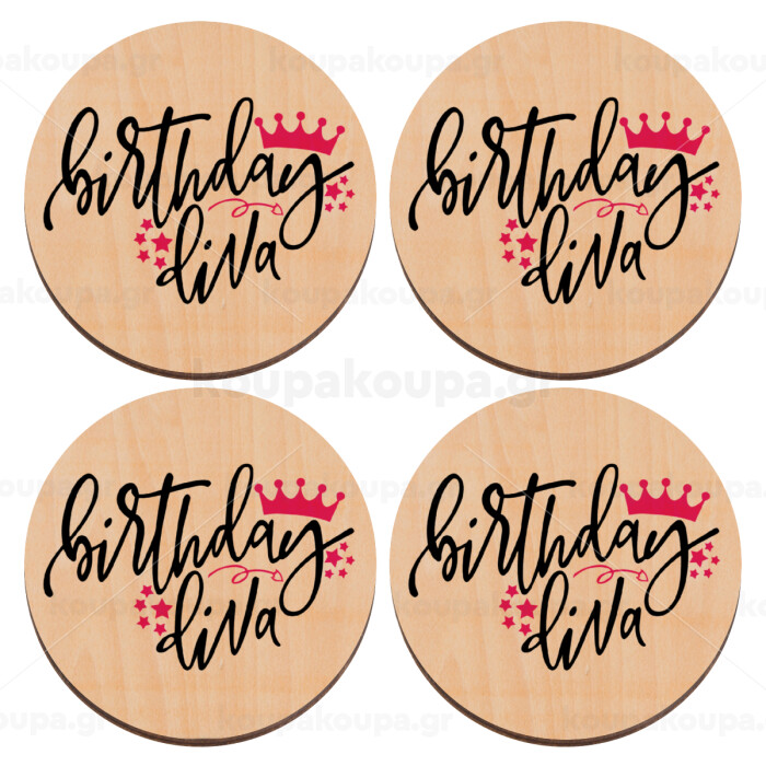 Birthday Diva queen, ΣΕΤ x4 Σουβέρ ξύλινα στρογγυλά plywood (9cm)