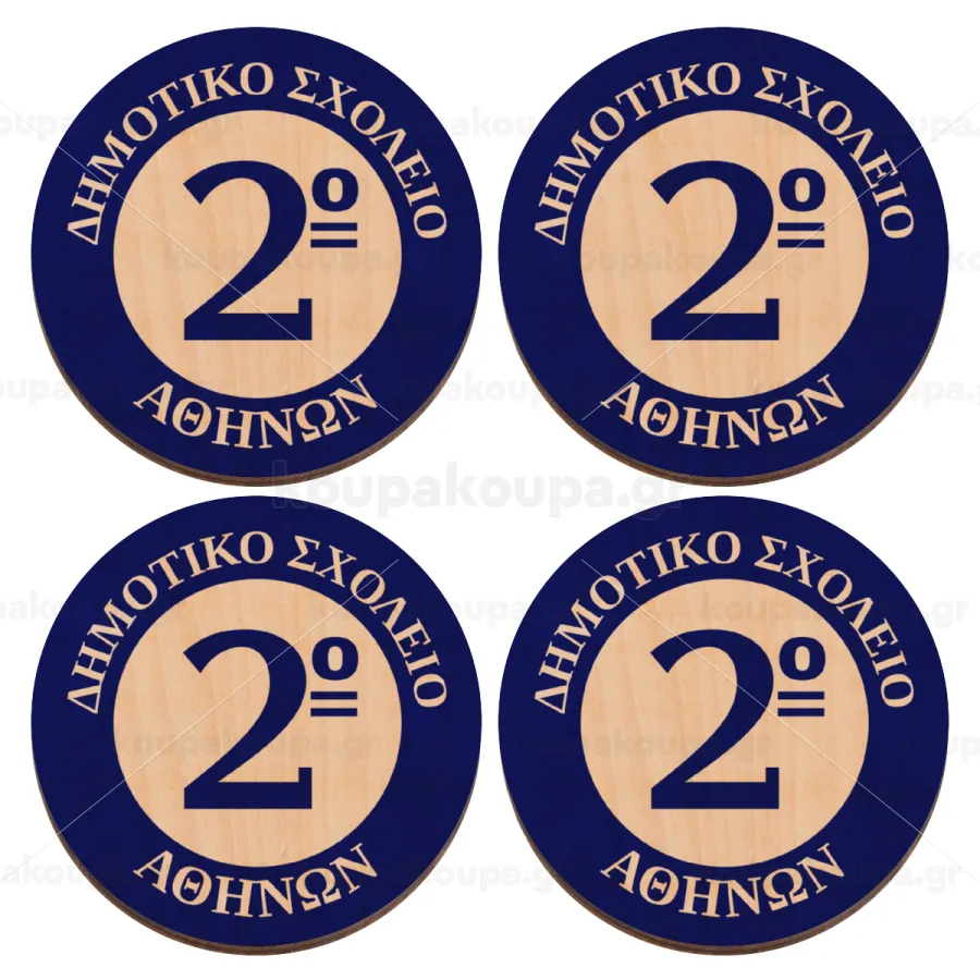 Έμβλημα Σχολικό μπλε, ΣΕΤ x4 Σουβέρ ξύλινα στρογγυλά plywood (9cm)
