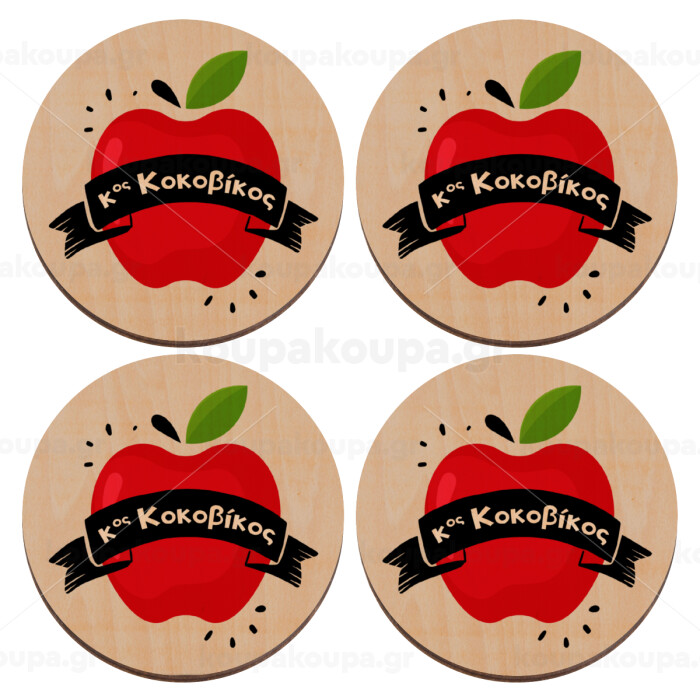 Αναμνηστικό Δώρο Δασκάλου Κόκκινο Μήλο, ΣΕΤ x4 Σουβέρ ξύλινα στρογγυλά plywood (9cm)