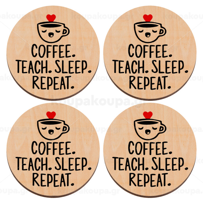 Coffee Teach Sleep Repeat, ΣΕΤ x4 Σουβέρ ξύλινα στρογγυλά plywood (9cm)