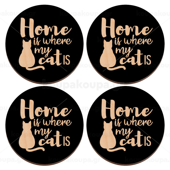 Home is where my cat is!, ΣΕΤ x4 Σουβέρ ξύλινα στρογγυλά plywood (9cm)