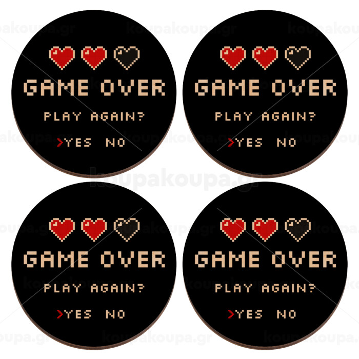GAME OVER, Play again? YES - NO, ΣΕΤ x4 Σουβέρ ξύλινα στρογγυλά plywood (9cm)