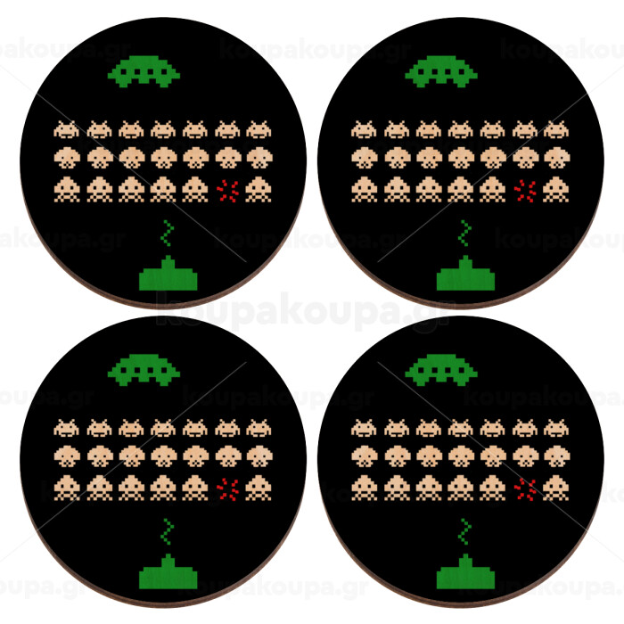 Space invaders, ΣΕΤ x4 Σουβέρ ξύλινα στρογγυλά plywood (9cm)