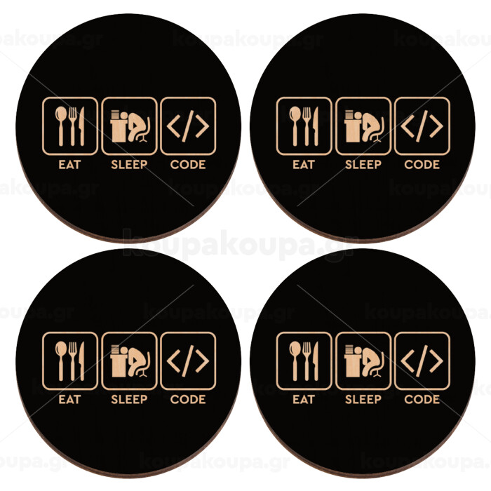 Eat Sleep Code, ΣΕΤ x4 Σουβέρ ξύλινα στρογγυλά plywood (9cm)