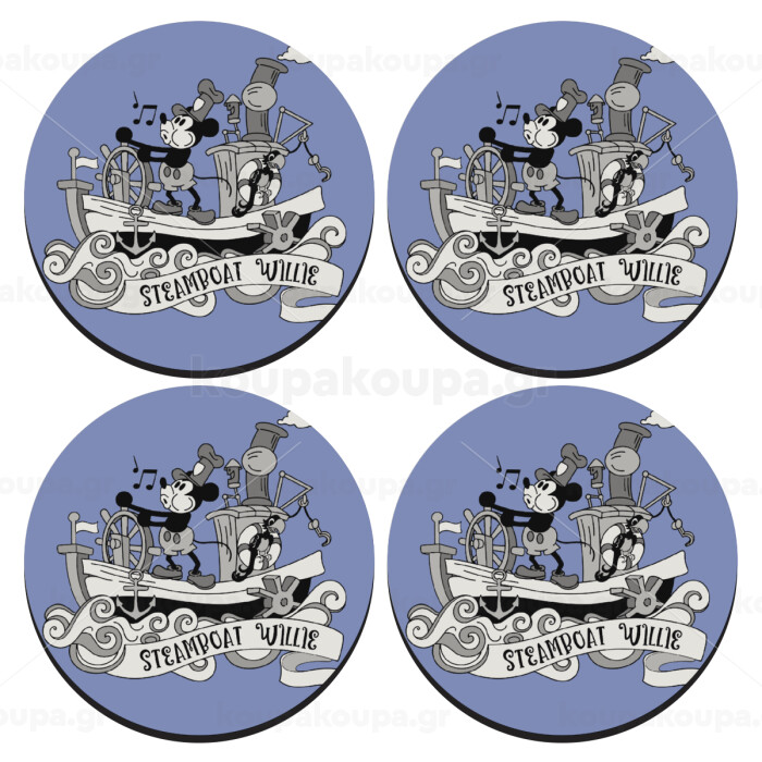 Mickey steamboat, ΣΕΤ 4 Σουβέρ ξύλινα στρογγυλά (9cm)