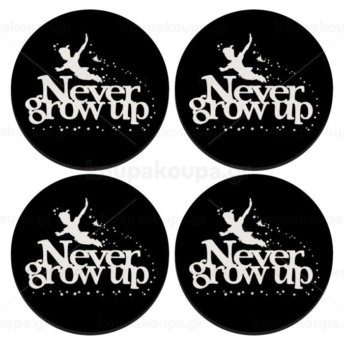 Peter pan, Never Grow UP, ΣΕΤ 4 Σουβέρ ξύλινα στρογγυλά (9cm)