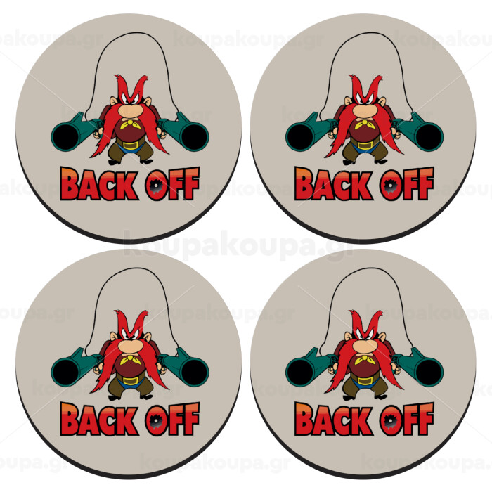 Yosemite Sam Back OFF, ΣΕΤ 4 Σουβέρ ξύλινα στρογγυλά (9cm)