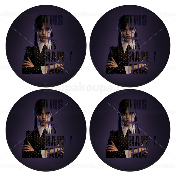 Wednesday, This is my happy face, ΣΕΤ 4 Σουβέρ ξύλινα στρογγυλά (9cm)