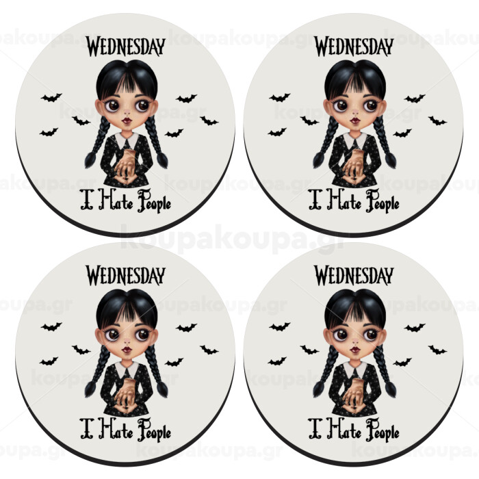 Wednesday Adams, i hate people, ΣΕΤ 4 Σουβέρ ξύλινα στρογγυλά (9cm)