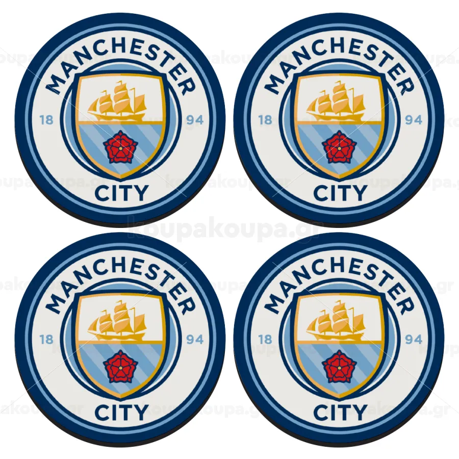 Manchester City FC , ΣΕΤ 4 Σουβέρ ξύλινα στρογγυλά (9cm)