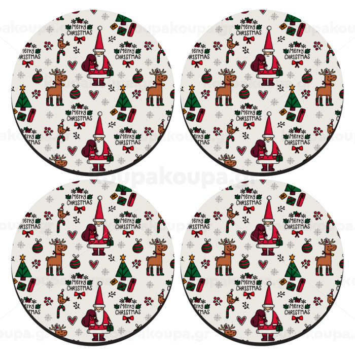 Santas, Deers & Trees, ΣΕΤ 4 Σουβέρ ξύλινα στρογγυλά (9cm)