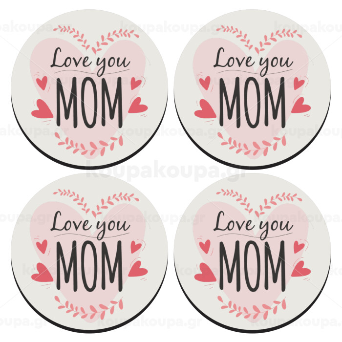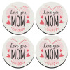 Mother's day I Love you Mom heart, ΣΕΤ 4 Σουβέρ ξύλινα στρογγυλά (9cm)