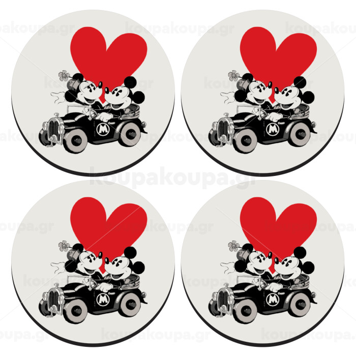 Mickey & Minnie love car, ΣΕΤ 4 Σουβέρ ξύλινα στρογγυλά (9cm)