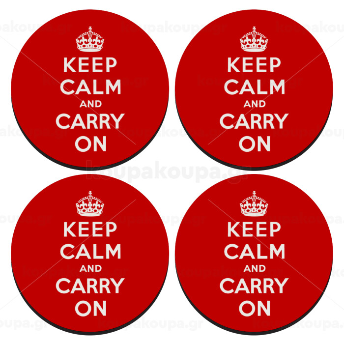 KEEP CALM  and carry on, ΣΕΤ 4 Σουβέρ ξύλινα στρογγυλά (9cm)