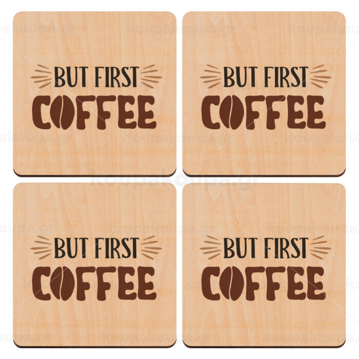 But first Coffee, ΣΕΤ x4 Σουβέρ ξύλινα τετράγωνα plywood (9cm)