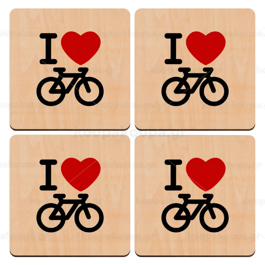 I love Bike, ΣΕΤ x4 Σουβέρ ξύλινα τετράγωνα plywood (9cm)