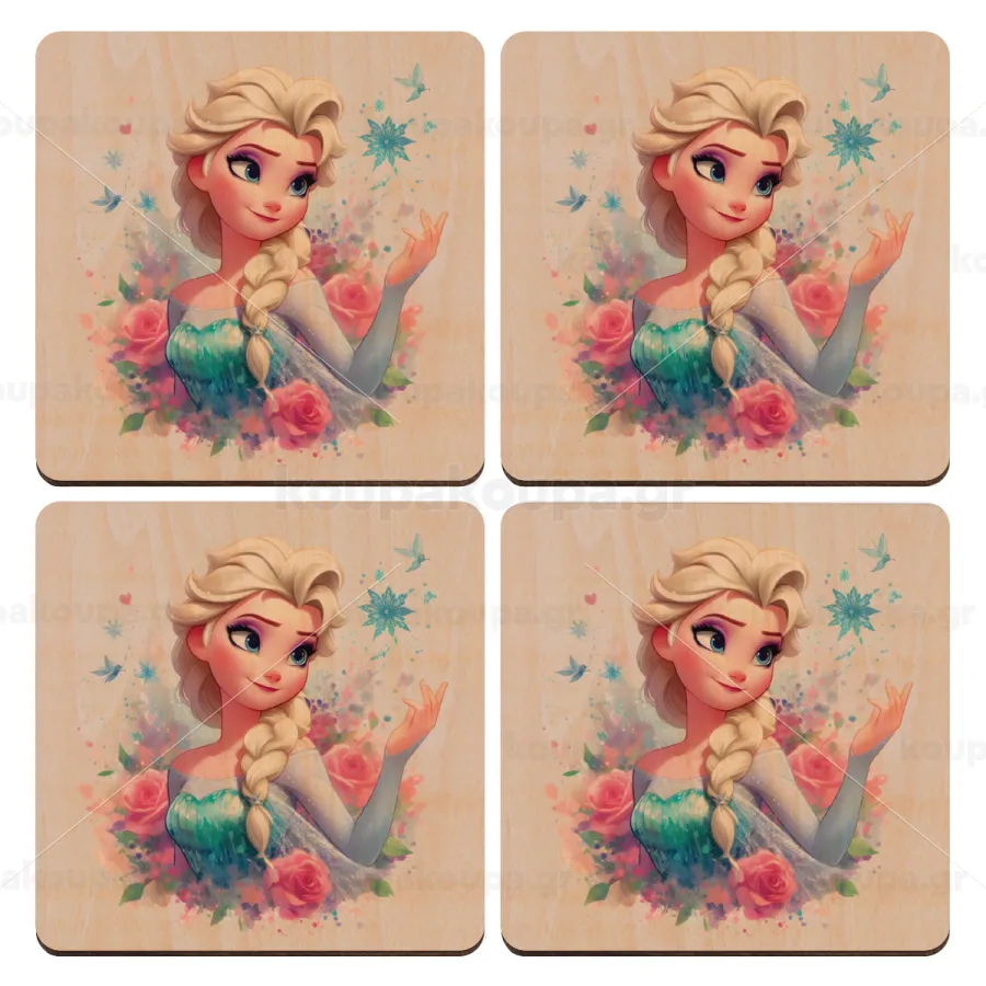 Elsa Princess, ΣΕΤ x4 Σουβέρ ξύλινα τετράγωνα plywood (9cm)