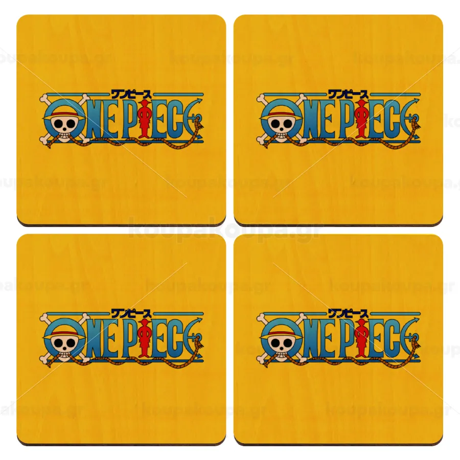 Onepiece logo, ΣΕΤ x4 Σουβέρ ξύλινα τετράγωνα plywood (9cm)