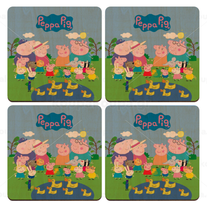 Peppa pig Family, ΣΕΤ x4 Σουβέρ ξύλινα τετράγωνα plywood (9cm)