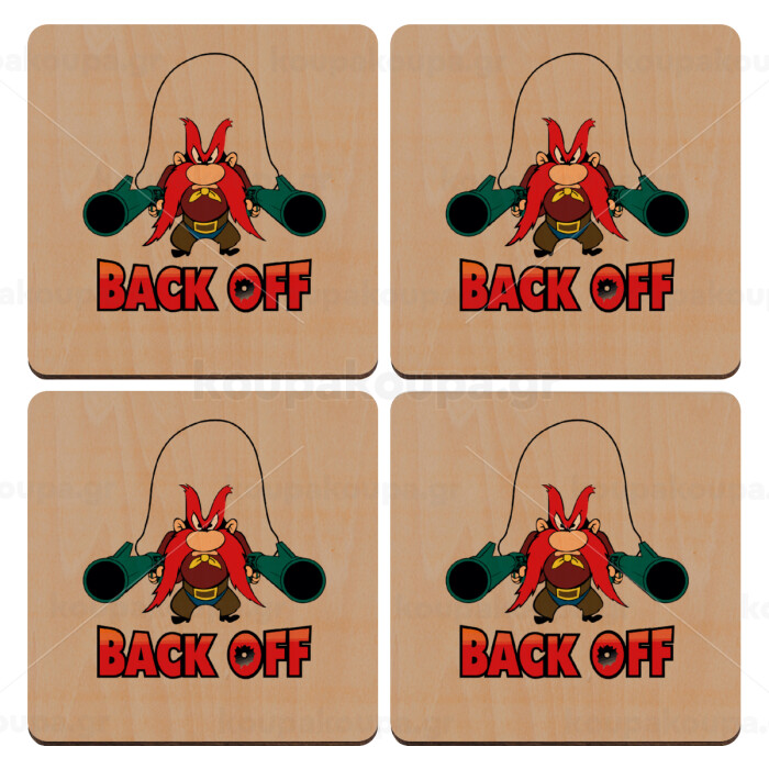 Yosemite Sam Back OFF, ΣΕΤ x4 Σουβέρ ξύλινα τετράγωνα plywood (9cm)