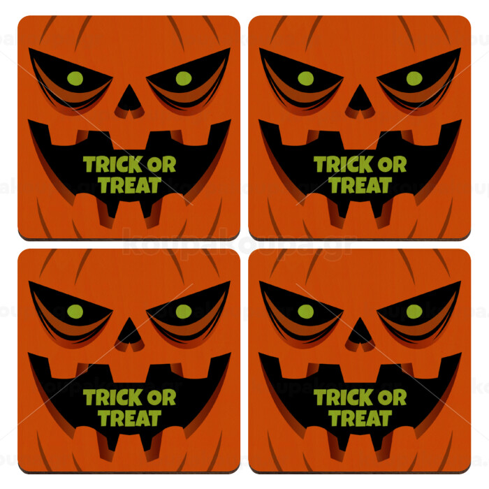 Halloween trick or treat Pumpkins, ΣΕΤ x4 Σουβέρ ξύλινα τετράγωνα plywood (9cm)