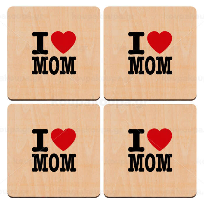 I LOVE MOM, ΣΕΤ x4 Σουβέρ ξύλινα τετράγωνα plywood (9cm)