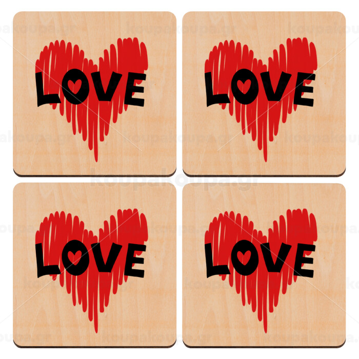 I Love You red heart, ΣΕΤ x4 Σουβέρ ξύλινα τετράγωνα plywood (9cm)
