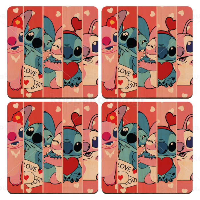 Lilo & Stitch Love, ΣΕΤ x4 Σουβέρ ξύλινα τετράγωνα plywood (9cm)